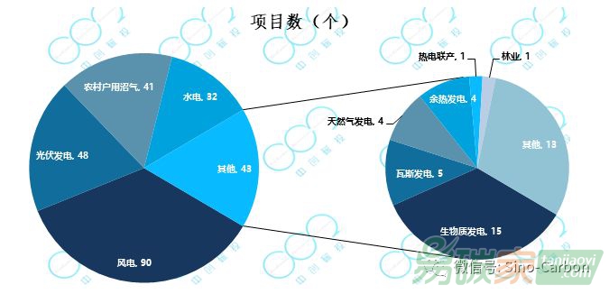 減排量備案項目287個。獲得減排量備案的項目中掛網(wǎng)公示254個,合計備案減排量5283萬噸CO2e。從項目類別看,已獲得減排量備案且材料公示的254個項目中,有第一類項目139個,合計備案減排量1890萬噸CO2e;第二類項目17個,備案減排量372萬噸CO2e;第三類項目98個,備案減排量3031萬噸CO2e。從項目類型看,風(fēng)電、光伏、農(nóng)村戶用沼氣、水電等項目較多,詳細(xì)情況如下圖所示: