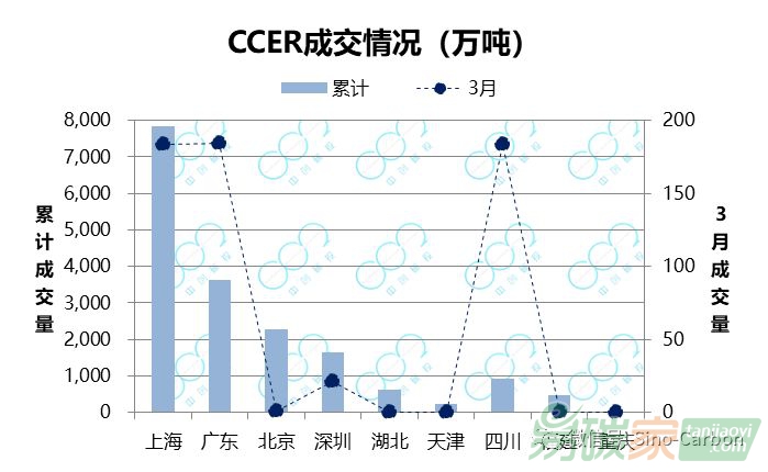 四川CCER均有成交,累計成交量573.46萬噸,較2月(83.08萬噸)擴(kuò)大了近6倍。