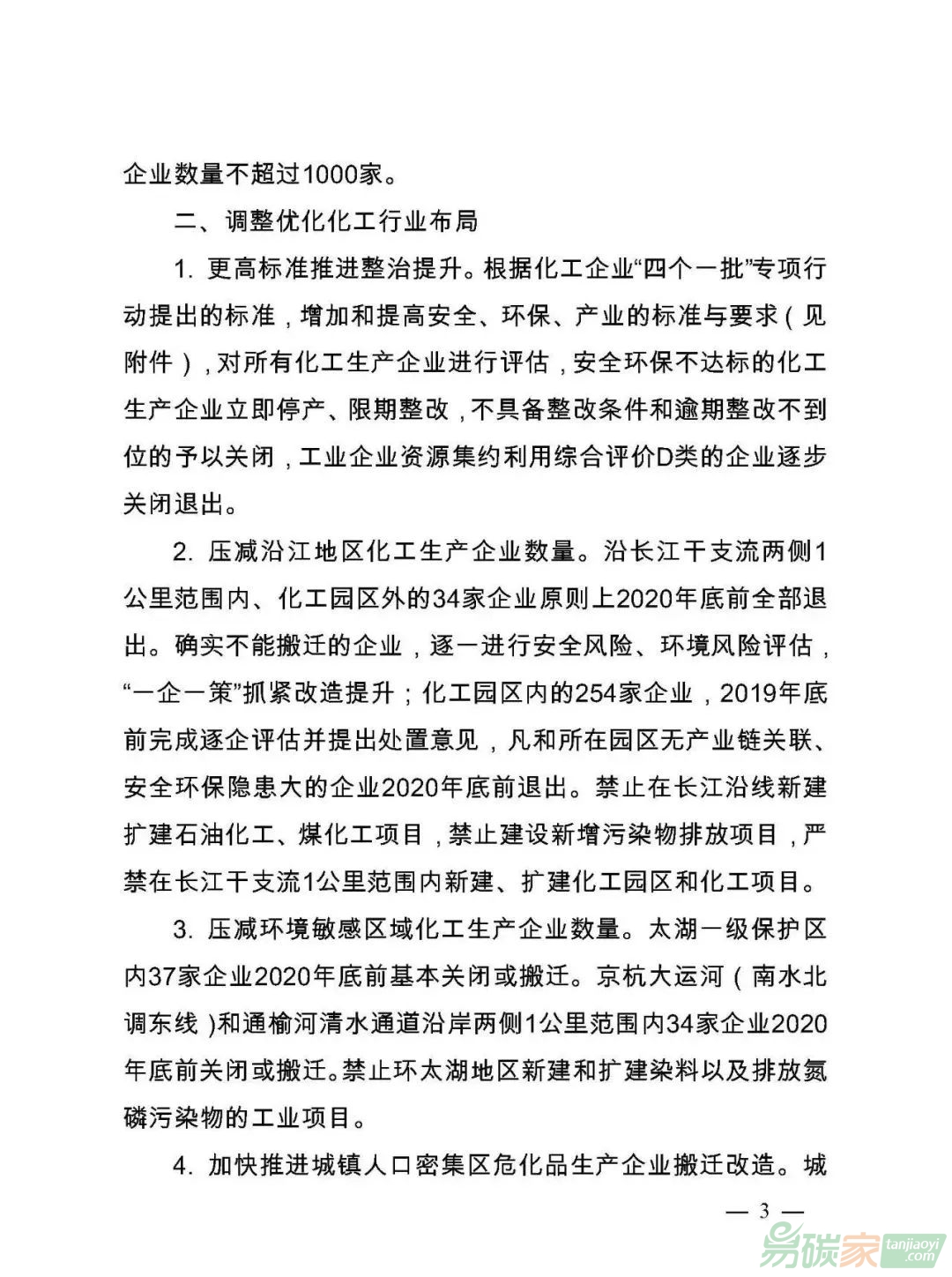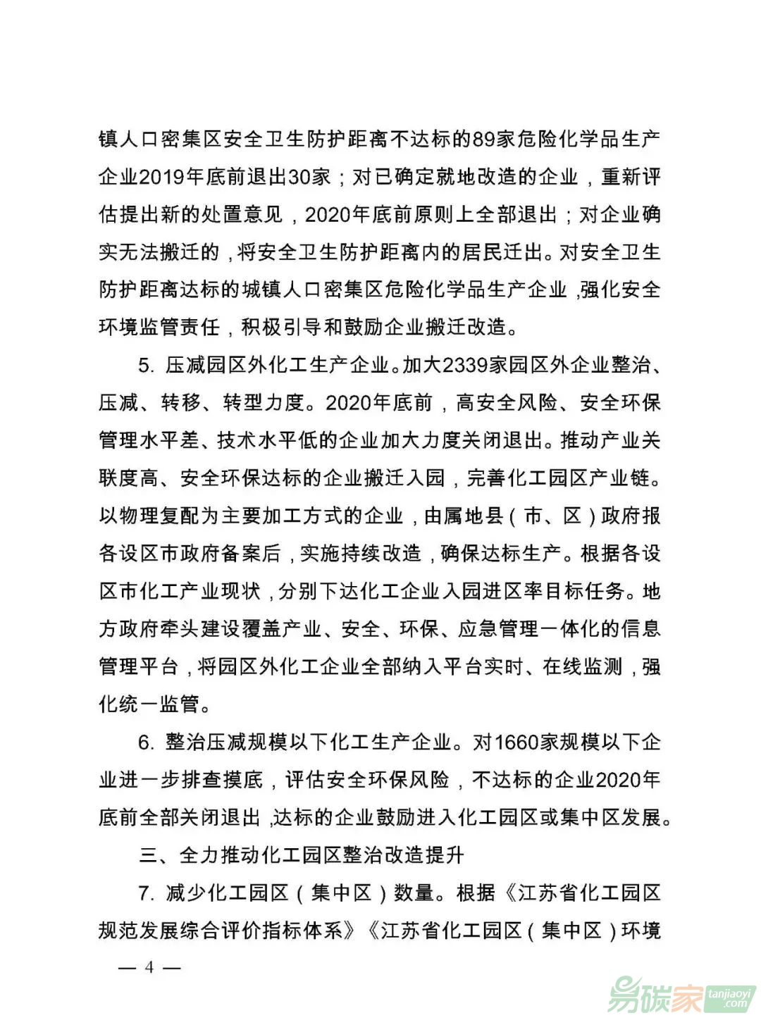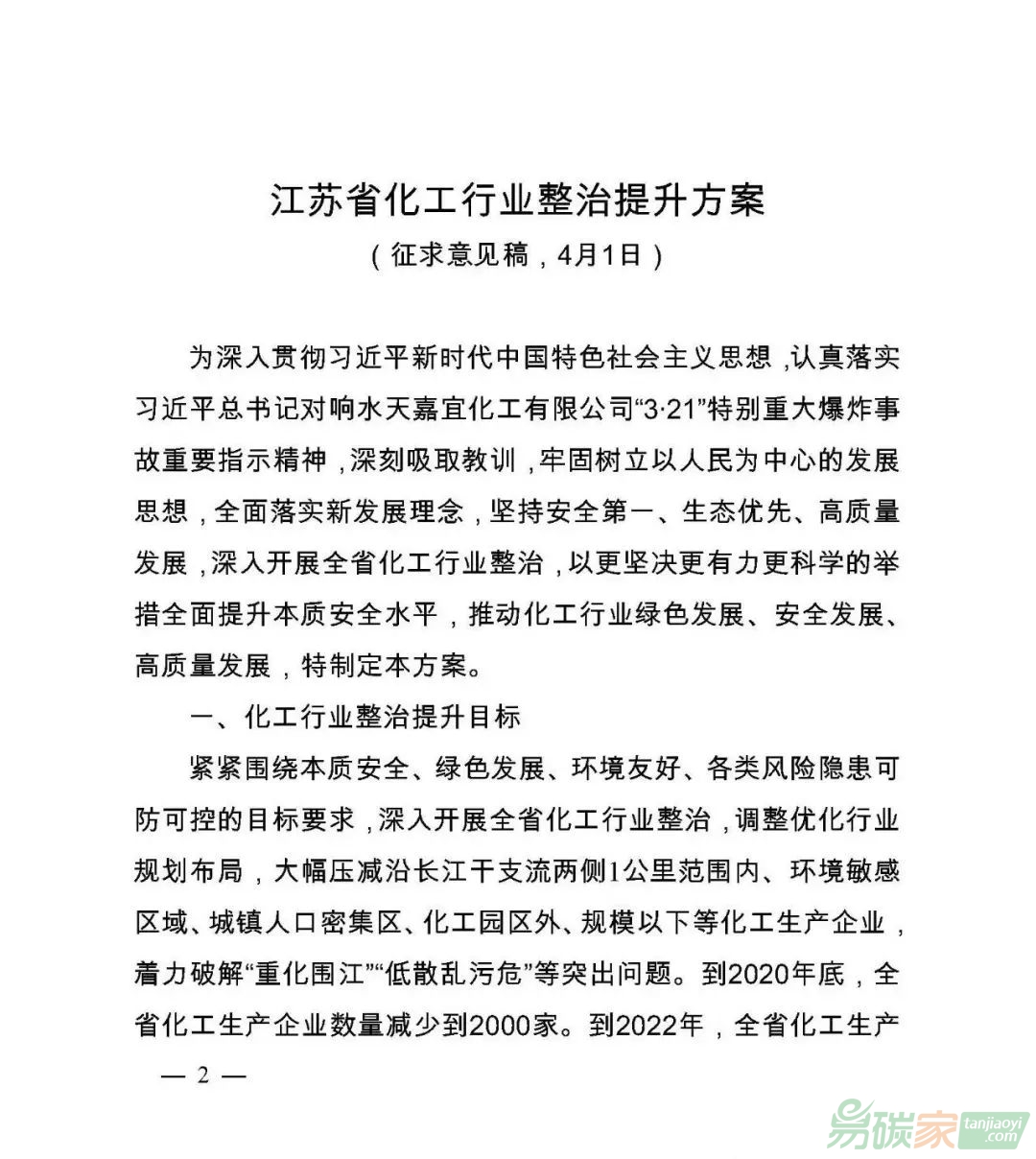 同時,自江蘇省“3.21”響水化工廠爆炸事故發(fā)生之后,江蘇省人民政府辦公廳發(fā)布了關(guān)于征求《江蘇省化工行業(yè)整治提升方案(征求意見稿)》(以下簡稱“方案”)意見的緊急通知。對未來五年之內(nèi),江蘇省化工企業(yè)、化工園區(qū)的改造升級及退出做出了明確指示。