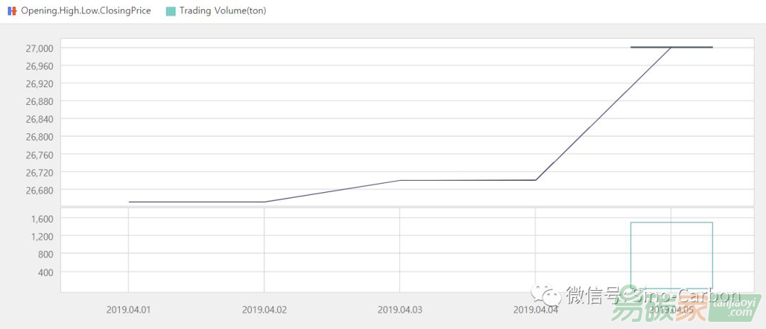韓國(guó)碳市場(chǎng)2019年04月01日至2019年04月07日,韓國(guó)碳市場(chǎng)價(jià)格在26650-27000韓元/噸之間波動(dòng)(約23.42-23.73美元/噸)。