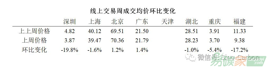 福建市場(chǎng)價(jià)格降幅相對(duì)明顯,較前一周下降了近20%,其中深圳市場(chǎng)自春節(jié)后價(jià)格總體呈下滑態(tài)勢(shì),上周平均成交價(jià)格跌至4元/噸;福建市場(chǎng)自3月上旬恢復(fù)成交以來(lái)價(jià)格持續(xù)走低,上周平均成交價(jià)格跌破10元/噸。上周,其他試點(diǎn)地區(qū)市場(chǎng)價(jià)格表現(xiàn)穩(wěn)定,上海、北京、廣東(21.79元/噸)、湖北(28.23元/噸)、重慶(3.70元/噸)市場(chǎng)的平均價(jià)格與前一周基本持平。上周天津配額市場(chǎng)無(wú)成交。