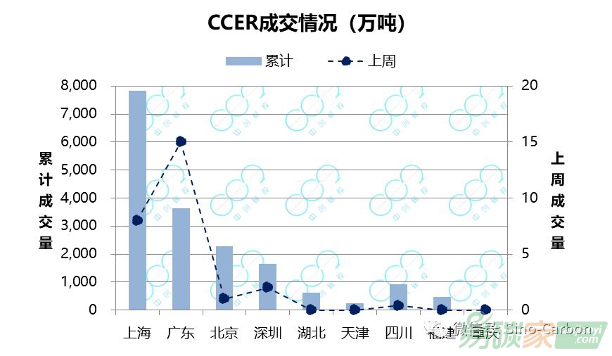 碳市場(chǎng)一、二級(jí)配額現(xiàn)貨市場(chǎng)共計(jì)成交250.8萬(wàn)噸,總成交額4884.3萬(wàn)元,均較前一周(415.8萬(wàn)噸,8321.1萬(wàn)元)下降了40%左右。其中廣東市場(chǎng)的貢獻(xiàn)最大:上周實(shí)現(xiàn)交易234.5萬(wàn)噸,成交額4355.2萬(wàn)元,在各試點(diǎn)總成交中占比均超過(guò)90%。在連續(xù)兩周發(fā)生交易的區(qū)域市場(chǎng)中,除廣東的成交量和成交額均下降了40%左右之外,深圳、上海、重慶上周交易較前一周也有所下降。其中,深圳市場(chǎng)上周成交1萬(wàn)噸,成交額3.4萬(wàn)元,較前一周分別下降了86%和97%;上海市場(chǎng)上周成交12噸,成交額474元,較前一周降幅達(dá)100%;重慶上周成交147噸,成交額544元,均較前一周下降了86%左右。北京、湖北、福建上周的成交量和成交額較前一周有所上漲,其中北京市場(chǎng)漲幅最為明顯,實(shí)現(xiàn)交易12.7萬(wàn)噸,成交額469.4萬(wàn)元,分別約為前一周的20倍和10倍。上周天津市場(chǎng)無(wú)成交。