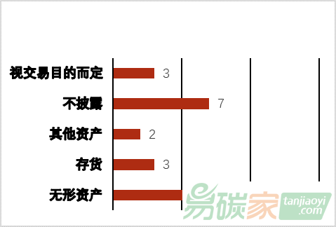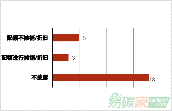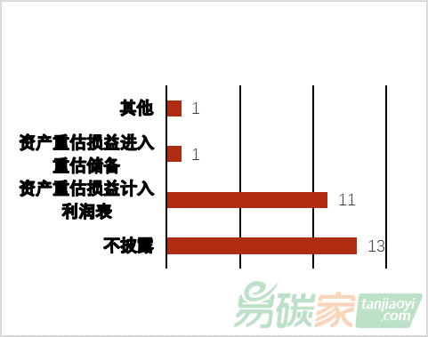 國際上碳排放會計準則的缺失造成不同公司間的財務(wù)報告存在差異,影響會計信息的可比性。特許公認會計師公會(ACCA)2010年對26家歐盟碳排放體系下公司的一項調(diào)查顯示,公司對碳配額的處理方式差異較大。在對碳配額的初始計量上,對于免費發(fā)放的配額,11家公司將其視為無形資產(chǎn)入賬,2家公司視作存貨入賬,6家公司作為其他資產(chǎn)入賬,而7家公司則選擇不做賬務(wù)處理;對于購買的配額,11家公司作為無形資產(chǎn),7家公司不做披露,3家公司作為存貨,2家公司作為其他資產(chǎn),3家公司視交易目的而定,對履約目的配額和交易目的配額采取不同的處理方式。在后續(xù)計量上,5家公司不進行攤銷和折舊,3家公司進行攤銷或折舊,而另18家公司的處理方式并未公布;在資產(chǎn)重估處理上,13家公司并未公布處理方式,11家公司將估值損益直接計入利潤表,1家公司將估值損益計入重估儲備科目,1家公司做其他賬務(wù)處理(如圖1-圖4所示)。由上述數(shù)據(jù)可以看出,不同公司對碳配額會計處理的方式存在差異,將其確認為無形資產(chǎn)的賬務(wù)處理方式較常見,但存在信息披露不完全的現(xiàn)象[4]。