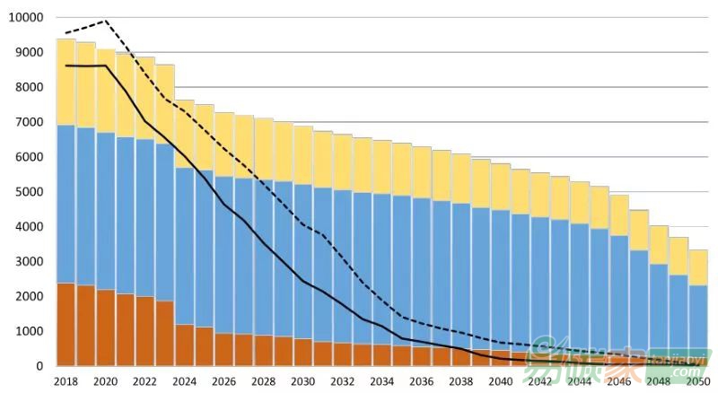 經(jīng)合組織=橙色、中國(guó)=藍(lán)色、其他=黃色、1.5攝氏度=實(shí)線、2攝氏度=虛線