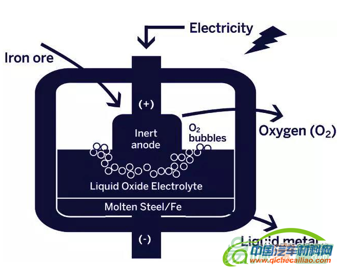 Boston metals熔融氧化電解工藝?yán)秒娔軐⒔饘購脑佳趸镛D(zhuǎn)化為熔融金屬產(chǎn)品。 MOE工藝是在麻省理工學(xué)院實(shí)驗(yàn)室發(fā)明的,而波士頓金屬公司已經(jīng)將這項(xiàng)技術(shù)的規(guī)模擴(kuò)大了1000倍以上。原理如下圖所示:
