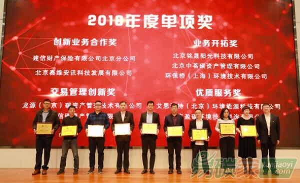 認(rèn)證集團(tuán)股份有限公司、中碳能投科技(北京)有限公司等獲選環(huán)交所2018年度“十佳會員”。九家企業(yè)榮獲四個單項獎,北京賽維安訊科技發(fā)展有限公司、建信財產(chǎn)保險有限公司北京分公司獲得“創(chuàng)新業(yè)務(wù)合作獎”,龍源(北京)碳資產(chǎn)管理技術(shù)有限公司、上海置信碳資產(chǎn)管理有限公司獲得“交易管理創(chuàng)新獎”,北京銘晟陽光科技有限公司、北京中茗碳資產(chǎn)管理有限公司  、環(huán)保橋(上海)環(huán)境技術(shù)有限公司獲得“業(yè)務(wù)開拓獎”,艾恩沃特(北京)環(huán)境能源科技有限公司、上海盈碳環(huán)境技術(shù)咨詢有限公司獲得“優(yōu)質(zhì)服務(wù)獎”。龍源(北京)碳資產(chǎn)管理技術(shù)有限公司總經(jīng)理魏子杰、國泰君安證券股份有限公司固定收益外匯商品部