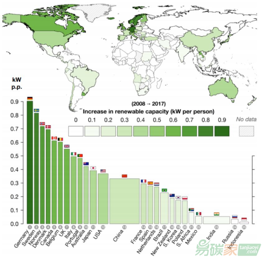 盡管中國(guó)和美國(guó)每年消耗的電力最多,分別為6500太瓦時(shí)和4250太瓦時(shí),但兩國(guó)都在2017年降低了各自的碳排放強(qiáng)度。事實(shí)上,如果中、美都能達(dá)到英國(guó)的減排目標(biāo),全球排放量將減少9%。 對(duì)可再生能源制定的目標(biāo)在一定程度上與每個(gè)國(guó)家的發(fā)電和儲(chǔ)存能力有關(guān)。 過(guò)去10年,全球新增的電力容量達(dá)1125千兆瓦。德國(guó)在這方面走在了前面,在指定時(shí)間范圍內(nèi),德國(guó)人均可再生能源能力接近1千瓦,太陽(yáng)能和風(fēng)能人均供應(yīng)量分別排名第1和第3。 德國(guó)對(duì)可再生能源的推動(dòng)可以說(shuō)是歐洲更廣泛趨勢(shì)中的一部分。排名前10位的國(guó)家中有8個(gè)來(lái)自該地區(qū),剩下的兩個(gè)分別是排名第5的加拿大和排名第10的澳大利亞。