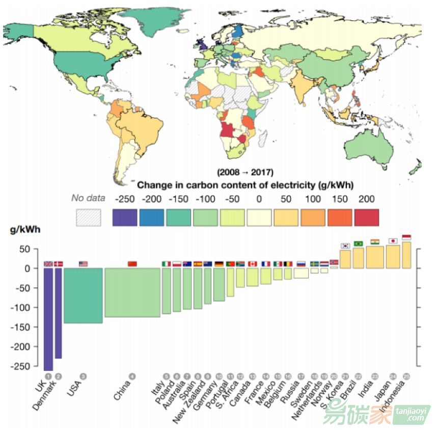 清潔電力支撐著幾乎所有向無(wú)碳未來(lái)轉(zhuǎn)變的努力。2017年,全球平均電力碳強(qiáng)度為450(克/千瓦時(shí))。 在低于這一平均水平的16個(gè)主要國(guó)家中,英國(guó)脫碳過(guò)渡的速度最快。