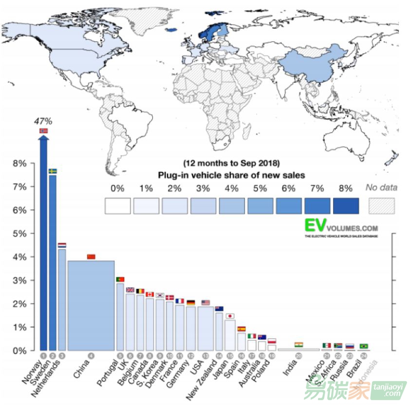 就個(gè)人層面而言,隨著越來(lái)越多的人試圖減少自己在生活中產(chǎn)生的碳排放,全球電動(dòng)汽車銷量因此正在迅速增長(zhǎng)。 如今,已有超過(guò)450萬(wàn)輛電動(dòng)車上路,其中120萬(wàn)輛是在2017年售出。 盡管如此,只有一個(gè)國(guó)家的插電式汽車銷量達(dá)到了新車銷量的10%。 自上世紀(jì)80年代以來(lái),挪威一直在提供電動(dòng)汽車激勵(lì)措施,并從中獲得了豐厚的回報(bào),其電動(dòng)車市場(chǎng)份額達(dá)到了驚人的47%。