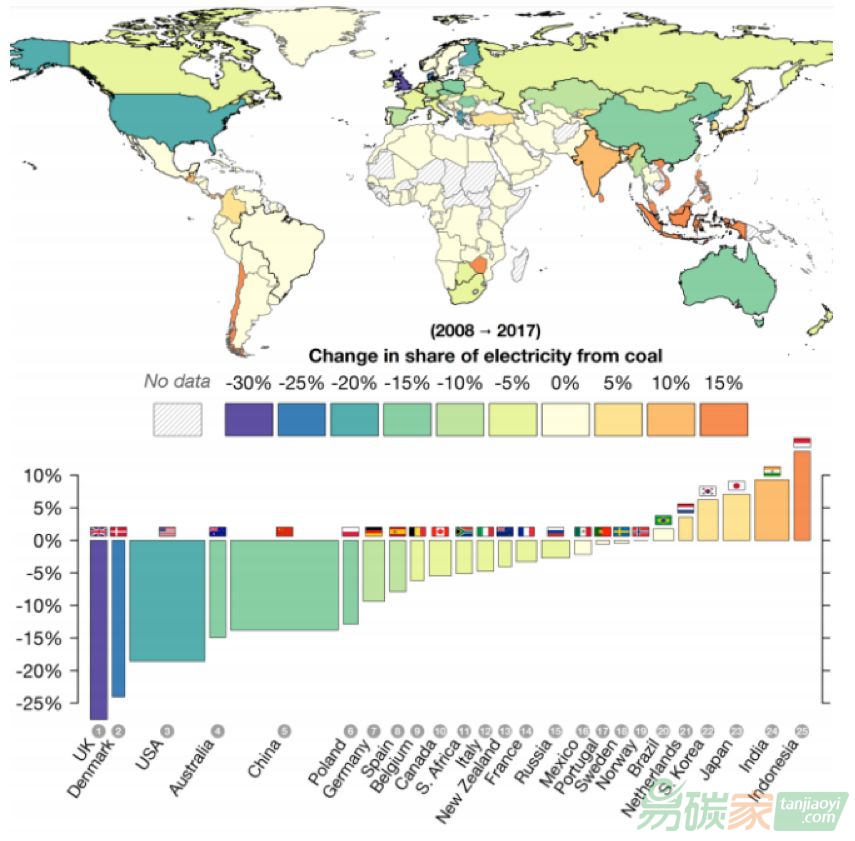 可再生能源并不是一個(gè)新概念。 早在18世紀(jì)和19世紀(jì)的工業(yè)革命期間,人們就開始利用風(fēng)能和水能等可再生能源,但由于在一個(gè)注重進(jìn)步的世界里,它們的效率不及煤炭和后來(lái)的石油,最終被擱置一旁。 從那時(shí)起,煤炭一直是污染最嚴(yán)重的發(fā)電燃料。而為了實(shí)現(xiàn)將全球變暖限制在2°C以內(nèi)的目標(biāo),人類不能再把它當(dāng)做能量來(lái)源。 在煤炭發(fā)電比例最低的國(guó)家中,歐洲又一次走在了前面,在前10名中占據(jù)了6席。 挪威以0%位居榜首。相對(duì)的,排名最后的6個(gè)國(guó)家中有3個(gè)來(lái)自亞洲,分別是印度尼西亞、中國(guó)和印度。 南非在該報(bào)告評(píng)估的25個(gè)國(guó)家中排名最后,該國(guó)近90%的電力使用的是煤炭。 從煤炭發(fā)電占比變化的10年數(shù)據(jù)中可以看到,其變化規(guī)律與脫碳變化趨勢(shì)相似,英國(guó)和丹麥位于領(lǐng)先地位。 美國(guó)和中國(guó)也正在取得進(jìn)展,都在前5名之列,分別下降了18%和14%。