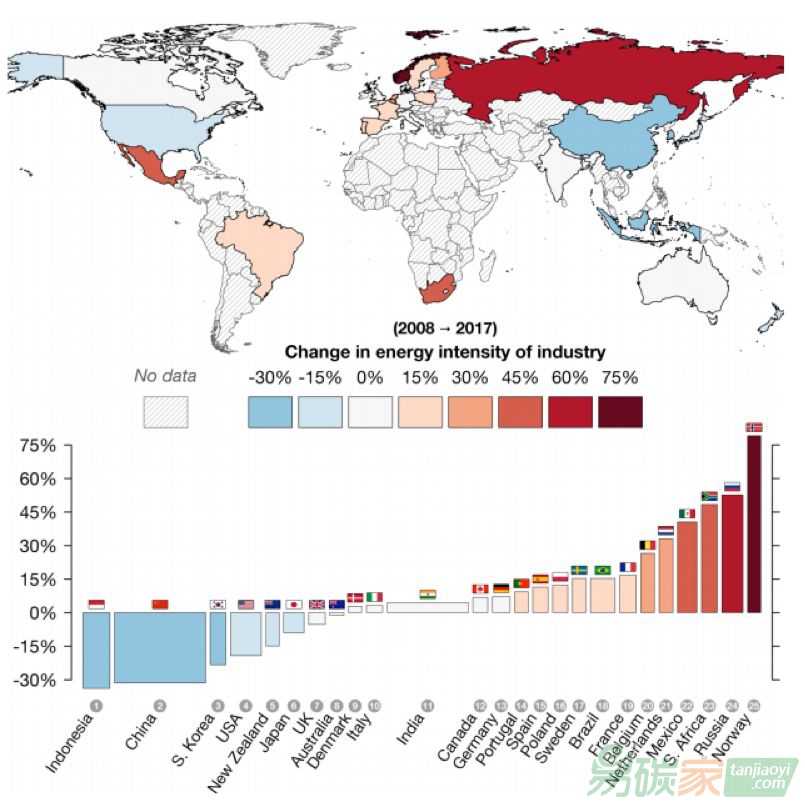 印度、印尼和中國(guó)的交通能源強(qiáng)度增幅最大,中國(guó)達(dá)到75%。除此之外,中國(guó)和印尼在工業(yè)能源強(qiáng)度變化率最高的國(guó)家中也名列榜首,在過(guò)去十年中下降了30%。