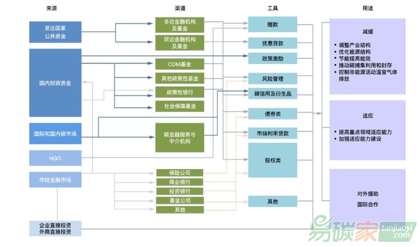 2005年以來,國內(nèi)通過直接贈(zèng)款、以獎(jiǎng)代補(bǔ)、稅收減免、政策型基金、投資國有資產(chǎn)等形式投向氣候變化領(lǐng)域,支持了大量應(yīng)對氣候變化行動(dòng),并撬動(dòng)了廣泛的社會(huì)資金(中國氣候投融資的來源、渠道、工具和用途, 如下頁圖所示)。