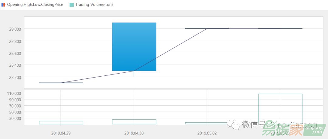 韓國碳市場2019年04月29日至2019年05月05日,韓國碳市場價格在28100-29000韓元/噸間波動(約24.15-25.02美元/噸)。