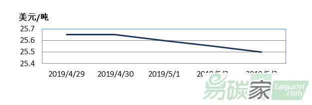 新西蘭碳市場2019年04月29日至2019年05月05日,新西蘭碳市場價格在25.50-25.65美元/噸之間波動。