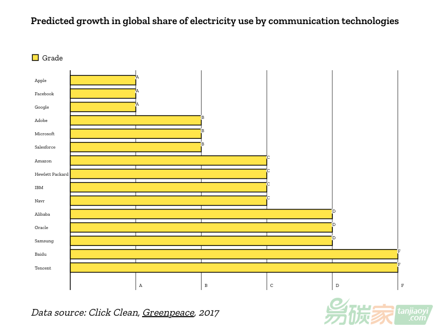 ▲ 對(duì)科技企業(yè)的可持續(xù)評(píng)分:蘋(píng)果、Google和Facebook為A等級(jí),而百度和騰訊被評(píng)為F等級(jí),中國(guó)的科技巨頭似乎還沒(méi)有大舉加入環(huán)保賽道。圖自環(huán)保組織Greenpeace
