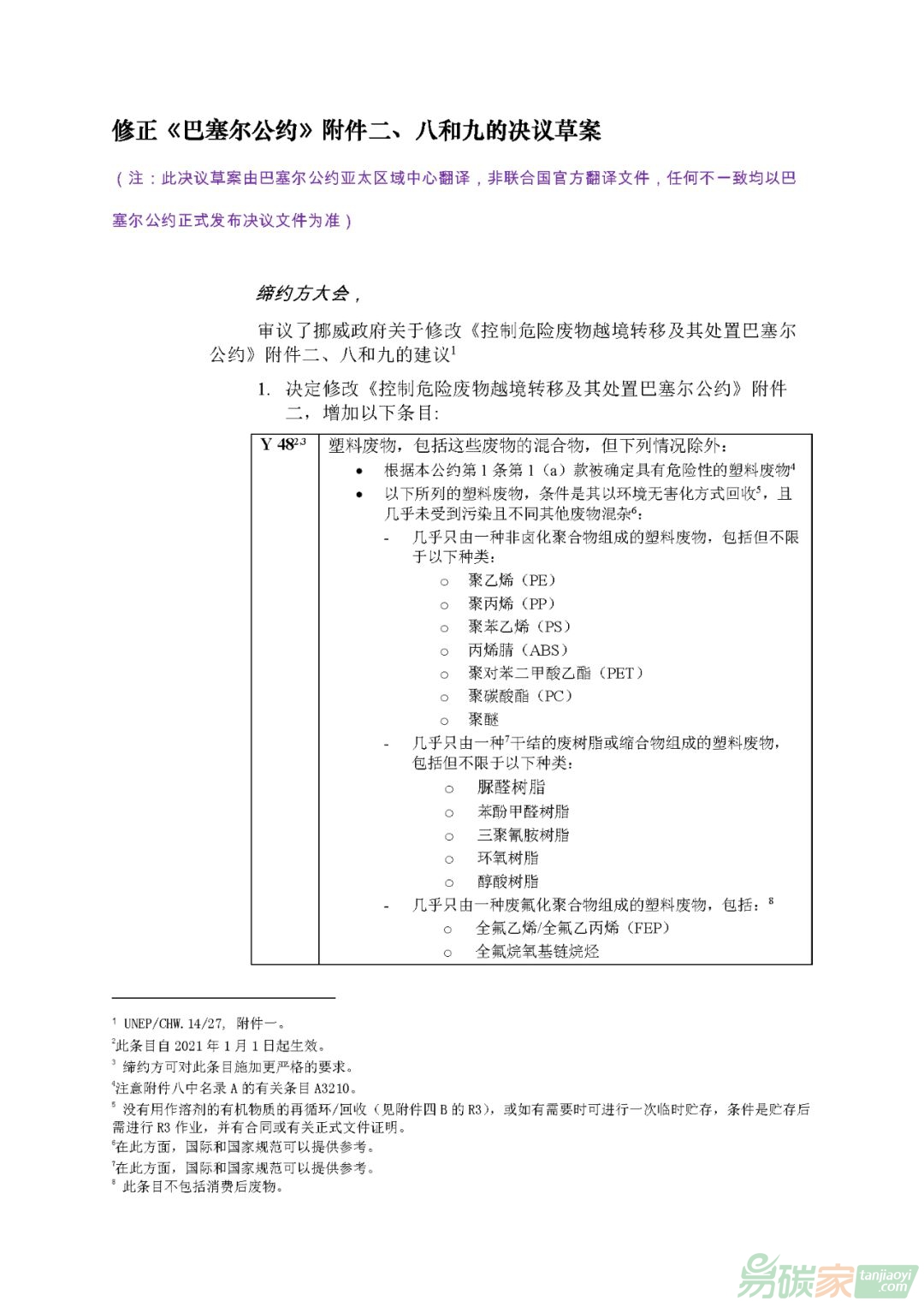 一是在附件二(公約受控的其他廢物)和附件八(公約受控的危險廢物)中增加了塑料廢物條目。