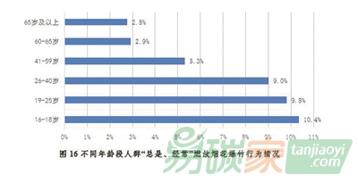 圖16 不同年齡段人群“總是、經(jīng)常”燃放煙花爆竹行為情況