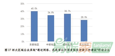 圖17 四大區(qū)域公眾采取“通過網(wǎng)絡(luò)、熱線等公開渠道給政府提工作建議”行動(dòng)占比