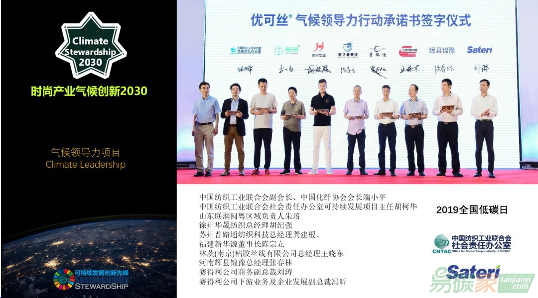 河南錦豫紡織品有限公司,于2019年6月19日,在福建長樂共同宣布加入時(shí)尚氣候創(chuàng)新2030行動,并簽署承諾書開展優(yōu)可絲?氣候領(lǐng)導(dǎo)力行動。中國紡織聯(lián)合會社會責(zé)任辦公室將聯(lián)手中國紡織信息中心等一批專業(yè)機(jī)構(gòu)支持賽得利及其價(jià)值鏈伙伴開展上述行動,將通過測量和評估優(yōu)可絲?纖維的價(jià)值鏈碳