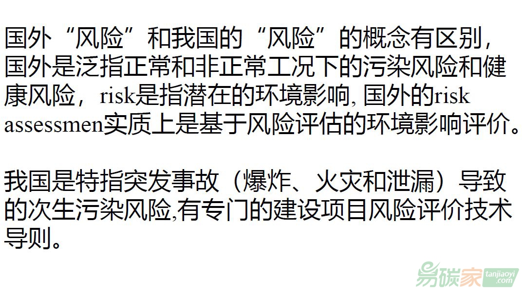 我們國家環(huán)境風(fēng)險(xiǎn)叫做突發(fā)環(huán)境事故的環(huán)境風(fēng)險(xiǎn),風(fēng)險(xiǎn)導(dǎo)則不管安全風(fēng)險(xiǎn)還是環(huán)境風(fēng)險(xiǎn),三個類型,爆炸、火災(zāi)和泄露。源頭導(dǎo)致二次污染才會做環(huán)境風(fēng)險(xiǎn),跟國外有潛在環(huán)境影響,都作為風(fēng)險(xiǎn)源,還是概念上的不一樣。