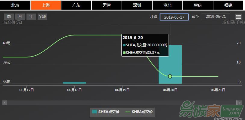 6月17日至6月21日,上海碳配額(SHEA)現(xiàn)貨線上累計(jì)成交21,000噸,較上周有所下降,協(xié)議轉(zhuǎn)讓無(wú)成交。本周,SHEA市場(chǎng)整體活躍度不高,量?jī)r(jià)呈現(xiàn)齊跌現(xiàn)象;從成交上看,僅周二、周四有交易達(dá)成。收盤(pán)價(jià)方面,SHEA價(jià)格雖然在周二重新站上40.50元/噸的高位,但隨后下滑走低,周四報(bào)收38.37元/噸,并維持至周五收盤(pán),較上周五同比下跌0.99元/噸。