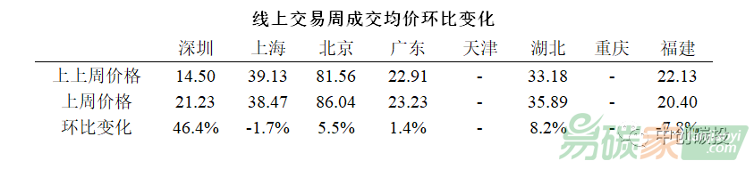 福建價格接近,在21元/噸左右。在連續(xù)兩周發(fā)生交易的區(qū)域市場中,深圳市場的價格變動幅度較大,較前一周上漲了46%;湖北、北京成交均價較前一周略有上漲,而福建市場成交均價有所下降;上海、廣東的市場價格表現(xiàn)最為穩(wěn)定,線上交易平均價格與前一周持平。上周天津、重慶配額市場線上無成交。