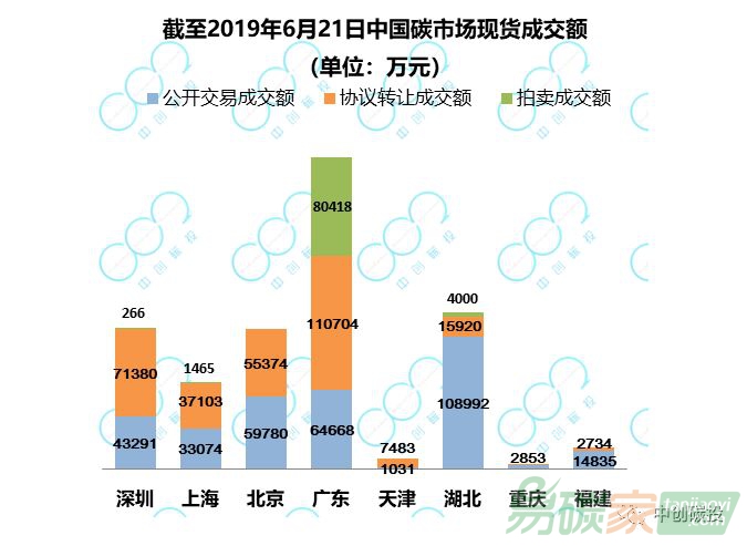 截至2019年6月21日,8個區(qū)域碳市場一、二級現(xiàn)貨市場累計成交3.30億噸,總成交額71.56億元。廣東、湖北成交量最高,位于第一梯隊;深圳、上海、北京位于第二梯隊;而天津、重慶、福建的成交量相對較低,位于第三梯隊。