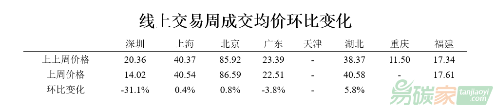 在連續(xù)兩周發(fā)生交易的區(qū)域市場(chǎng)中,深圳市場(chǎng)的價(jià)格變動(dòng)幅度最大,較前一周下跌了31%;湖北成交均價(jià)較前一周略有上漲;其他地區(qū)市場(chǎng)價(jià)格表現(xiàn)穩(wěn)定,線上交易平均價(jià)格與前一周持平。