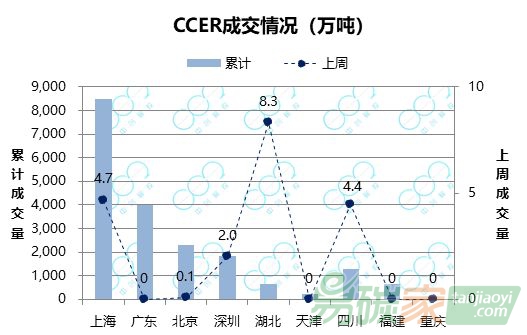 四川,兩市場(chǎng)分別成交4.7萬(wàn)噸、4.4萬(wàn)噸;深圳成交2萬(wàn)噸,北京成交1060噸;其他試點(diǎn)地區(qū)CCER市場(chǎng)無(wú)成交。