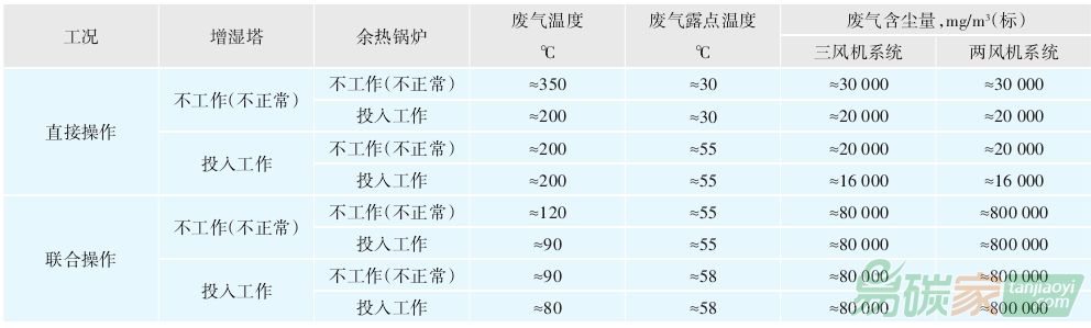 3實現(xiàn)水泥生產(chǎn)廢氣超低排放三項指標的技術探討及實踐3.1粉塵超低排放技術與實踐粉塵治理在水泥工業(yè)領域一直是最受重視的,也是在所有工業(yè)廢氣治理中做得較好的,但目前超低排放實施效果也不盡如人意。高性能除塵器的研究是實現(xiàn)粉塵超低排放的關鍵,而評價除塵器性能先進性的指標主要有四項:更高的除塵效率、更低的設備阻力、更可靠穩(wěn)定的設備性能和更低廉的運行維護成本。因此,如何降低水泥廢氣粉塵排放,我們主要進行了如下工作:(1)確定高效除塵裝備技術路線水泥窯尾廢氣處理系統(tǒng)都是按含生料磨烘干聯(lián)合操作廢氣考慮的,特點是工況參數(shù)常變,以典型的五級預熱器系統(tǒng)主設備串聯(lián)工藝為例,即圖1、2示意的工藝,至少可以產(chǎn)生如表3的工況參數(shù)。