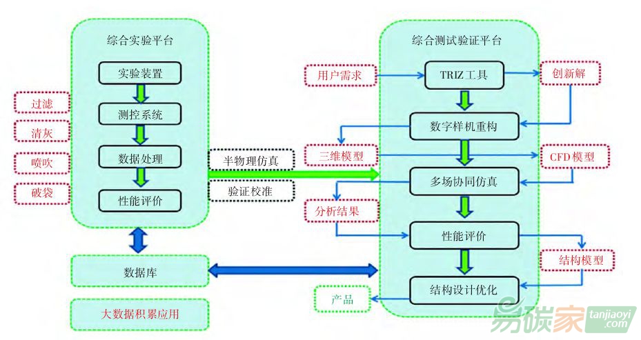 圖8袋式除塵器數(shù)字化設計與綜合研發(fā)平臺集成研發(fā)平臺解決了袋式除塵器產(chǎn)品創(chuàng)新的行業(yè)共性關鍵技術,包括:基于國際先進的TRIZ的集成創(chuàng)新技術、多場仿真技術、產(chǎn)品快捷和定制優(yōu)化技術、數(shù)字化樣機模型及重構技術、數(shù)字化仿真測試評價技術及組態(tài)化實驗驗證技術等,可實現(xiàn)開發(fā)袋式除塵器新產(chǎn)品變結構、新工藝、新型濾材等的綜