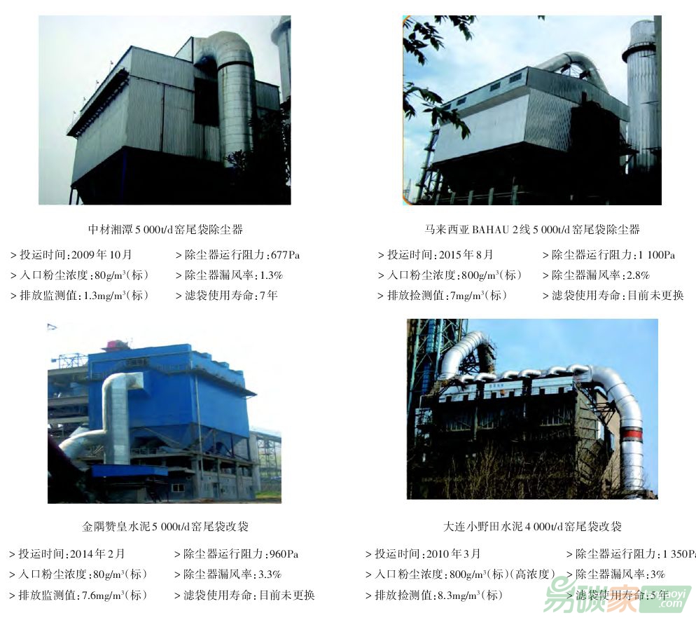 圖11典型應用案例介紹從檢測和監(jiān)測結果可見,粉塵排放基本可以實現(xiàn)“超低排放”。研發(fā)平臺應用于產(chǎn)品設計的同時,還應用于生產(chǎn),快速解決了很多除塵器及系統(tǒng)的實際問題。袋除塵器運行早期出現(xiàn)破袋問題。破袋原因很多很復雜,有結構設計不合理問題,也有除塵器前后工藝接入的進出風管路不合理問題。利用該平臺,我們解決了許多早期破袋問題。例如,2009年金隅集團收購贊皇水泥一條未建設完成的2500t/d水泥生產(chǎn)線后,直接委托我們將窯尾電除塵器改為袋除塵器,我們按常規(guī)在短期內(nèi)進行了改造。生產(chǎn)線剛開始投入運行時效果良好,但約3個月后出現(xiàn)排放超標。我們檢查發(fā)現(xiàn),有3條破袋產(chǎn)生,且集中在后部一個室內(nèi),我們僅進行了封堵處理。又運行1個月左右,出現(xiàn)了更嚴重的排放超標,濃煙滾滾。我們再進行檢查發(fā)現(xiàn),又有十幾條濾袋破損,而且跟上次是同一個室,這次引起了我們的重視,尋找各種設計結構、產(chǎn)品質(zhì)量問題,業(yè)主甚至直接請來知名專家,但都沒有找到實質(zhì)問題。我們再次簡單處理后繼續(xù)生產(chǎn),隨著運行時間的延長,問題沒有減輕的征兆,而且越來越嚴重,不得不停窯。停窯后我們再檢查發(fā)現(xiàn),破袋有50條以上,已經(jīng)不止一個室,同側臨近的室也有破袋,破損嚴重的已經(jīng)在離袋口100mm左右,出現(xiàn)環(huán)向1/2左右的橫斷口(圖12)。操作員打開廢氣風機后,我們在凈氣室內(nèi)觀察,竟發(fā)現(xiàn)有些袋籠晃動很大,甚至懸