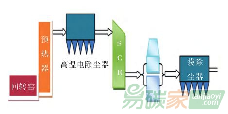 (2)水泥窯尾半塵SCR布置工藝圖16為水泥廠SCR脫硝的半塵布置或中塵(MiddleDust)布置工藝,它需要在SCR反應器之前安裝高溫電除塵器。因為高溫電除塵器的除塵效率不能達到很高,所以出口含塵量仍然較高,特別是除塵器電場事故致使廢氣含塵量高不可避免,半塵布置方案也與高塵方案存在同樣問題。另外,通過高溫電除塵器的氣體溫度還會有所降低,也不利于常規(guī)催化劑高效運行。國內(nèi)外實際應用的報導都同樣是不能穩(wěn)定運行。