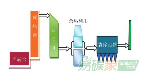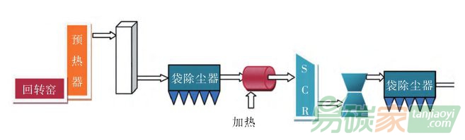(3)水泥窯尾低塵SCR布置工藝圖17為傳統(tǒng)的低塵布置工藝,采用傳統(tǒng)的高溫袋除塵器可以保證進入SCR反應器的廢氣含塵量極低,這樣粉塵對SCR催化劑的影響小。但由于傳統(tǒng)濾袋的耐溫限制,通常需要采用六級預熱器,或優(yōu)先通過SP余熱鍋爐降溫,或采用增濕塔將預熱器出口廢氣溫度降低到≤280℃,并且不允許出現(xiàn)超溫事故。降溫除塵后,為了滿足氮氧化物最佳催化還原反應溫度,需要對煙氣進行再加熱,這無疑會使工藝復雜且有能源消耗。如果研發(fā)出有效可靠的低溫催化劑,無需對氣體再加熱,則是一個理想的選擇。
