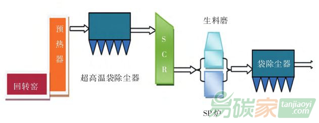市場,依據(jù)材料配方的不同,它們承受的溫度可以達到300~1000℃。天津水泥工業(yè)設計研究院有限公司和中材裝備集團有限公司環(huán)保分公司與相關廠家合作分別對以上超高溫過濾材料進行了實驗室測試,過濾精度完全可以媲美現(xiàn)有常規(guī)纖維氈類以及PTFE覆膜類各種濾料,過濾阻力不高于常規(guī)濾料,在較高的過濾風速下易于清灰。我們提出的水泥窯尾SCR新型低塵布置工藝見圖19。