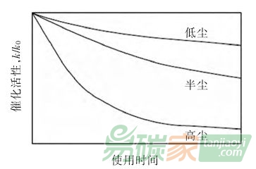 圖17低塵布置工藝國外有關研究實驗結果給出了催化劑活性使用壽命與氣體含塵量的關系(見圖18)。由此可見,氣體含塵量高會大大縮短水泥SCR脫硝催化劑的使用壽命,水泥窯尾的高塵布置方案會更糟。