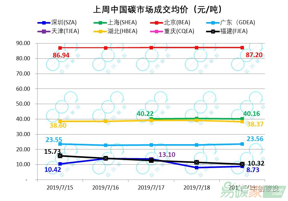 7月15日~7月19日,在配額二級(jí)市場(chǎng)公開交易成交價(jià)格方面,北京試點(diǎn)配額均價(jià)最高,達(dá)87.11元/噸;上海、湖北次之,成交均價(jià)分別為40.21元/噸、38.53元/噸;廣東成交均價(jià)22.81元/噸;深圳福建成交均價(jià)接近,在10.5元/噸左右;天津成交價(jià)格最低,為13.10元/噸。