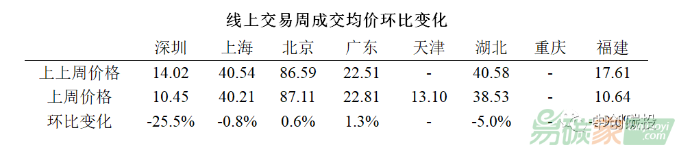 在連續(xù)兩周發(fā)生交易的區(qū)域市場(chǎng)中,福建市場(chǎng)的價(jià)格變動(dòng)幅度較大,較前一周下跌了近40%;深圳市場(chǎng)價(jià)格跌幅超過25%。湖北成交均價(jià)較前一周略有回落;其他地區(qū)市場(chǎng)價(jià)格表現(xiàn)穩(wěn)定,線上交易平均價(jià)格與前一周持平。