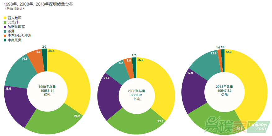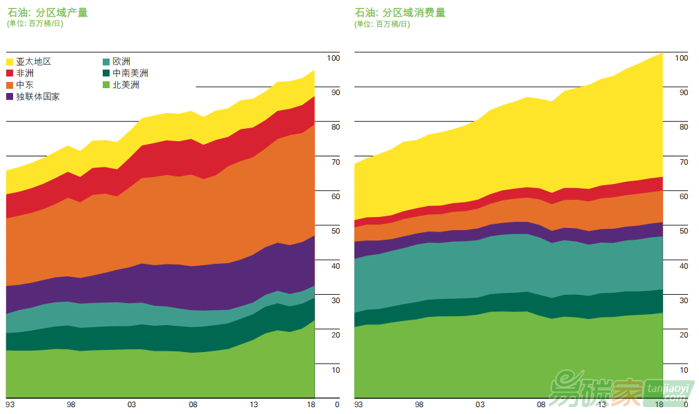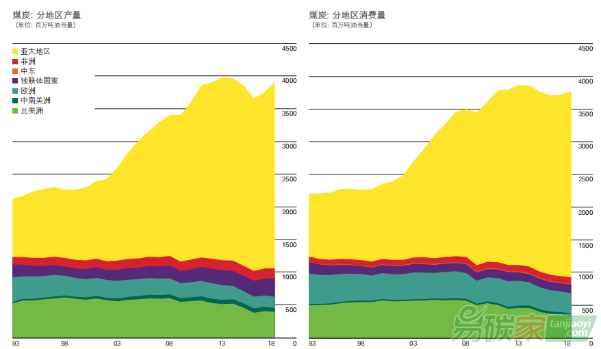 在2017年小幅回升的基礎(chǔ)上,煤炭消費(fèi)在2018年進(jìn)一步上升。煤炭消費(fèi)量(1.4%)和產(chǎn)量(4.3%)的增速均創(chuàng)近五年新高。產(chǎn)量增長(zhǎng)集中在亞太地區(qū)(16300萬噸油當(dāng)量) 。其中,約一半的全球增長(zhǎng)來自中國(guó),印度尼西亞產(chǎn)量增長(zhǎng)5100萬噸油當(dāng)量。煤炭消費(fèi)增長(zhǎng)為2013年以來最快增速。煤炭消費(fèi)的增長(zhǎng)同樣是由亞太地區(qū)(7100萬噸油當(dāng)量)驅(qū)動(dòng),尤其是印度(3600萬能噸油當(dāng)量)。十年之前,亞太地區(qū)占全球煤炭消費(fèi)的三分之二,如今這一比重已經(jīng)上升至四分之三。