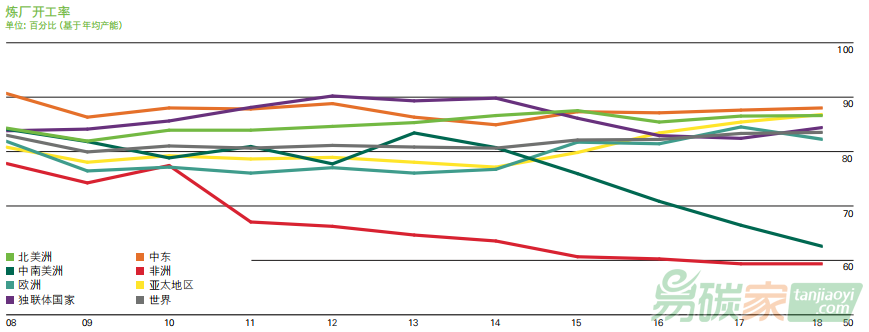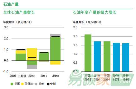 ③ 石油:年度平均油價(jià)(即期布倫特)從2017年的每桶54.19美元上漲至每桶71.31美元。 全球石油消費(fèi)增長(zhǎng)1.5%,即140萬桶/日。中國(guó)(68萬桶/日)和美國(guó)(50萬桶/日)是最主要消費(fèi)增長(zhǎng)來源。 全球石油產(chǎn)量增加220萬桶/日。幾乎所有的凈增長(zhǎng)都來自美國(guó),220萬桶/日打破了歷史上單一國(guó)家的年產(chǎn)量增長(zhǎng)記錄。此外,加拿大(41萬桶/日)和沙特阿拉伯(39萬桶/日)的產(chǎn)量增長(zhǎng)被委內(nèi)瑞拉(-58萬桶/日)和伊朗(-31萬桶/日)的減產(chǎn)抵消。 煉廠原油加工量增長(zhǎng)96萬桶/日,低于2017年150萬桶/日的同比增量。然而,煉廠平均開工率繼續(xù)攀升,達(dá)到2007年來的最高水平。