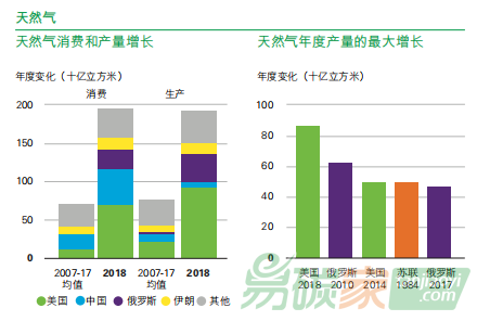美國(guó)的天然氣產(chǎn)量增長(zhǎng)860億立方米,增速達(dá)12%,主要增長(zhǎng)來自馬塞勒斯、海恩斯維爾和二疊盆地的頁巖氣。實(shí)際上,美國(guó)在去年創(chuàng)紀(jì)錄地實(shí)現(xiàn)兩項(xiàng)第一:?jiǎn)我粐?guó)家石油和天然氣年產(chǎn)量增長(zhǎng)歷史最高。這一成績(jī)消除了世人對(duì)頁巖革命影響力的質(zhì)疑。俄羅斯(340億立方米)、伊朗(190億立方米)和澳大利亞(170億立方米)對(duì)全球天然氣產(chǎn)量增長(zhǎng)也有所貢獻(xiàn)。