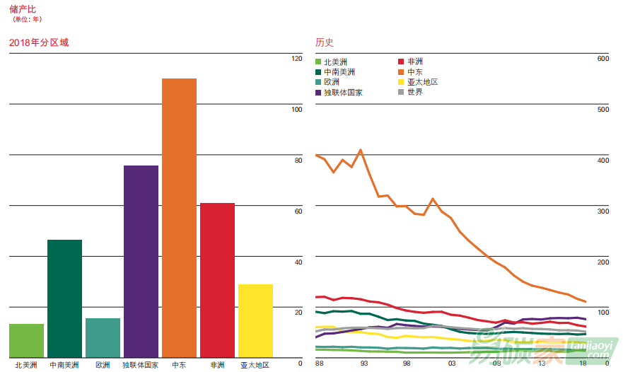 煤炭2018年全球煤炭?jī)?chǔ)量為1.055萬億噸,主要集中在少數(shù)幾個(gè)國(guó)家:美國(guó)(24%)、俄羅斯(15%)、澳大利亞(14%)和中國(guó)(13%)。其中大部分儲(chǔ)量為無煙煤和煙煤(70%)。根據(jù)2018年全球儲(chǔ)產(chǎn)比:全球煤炭還可以以現(xiàn)有的生產(chǎn)水平生產(chǎn)132年。其中,北美洲(342年)和獨(dú)聯(lián)體國(guó)家(329年)為儲(chǔ)產(chǎn)比最高地區(qū)。