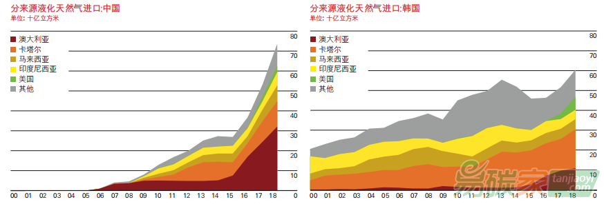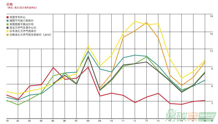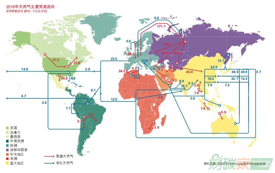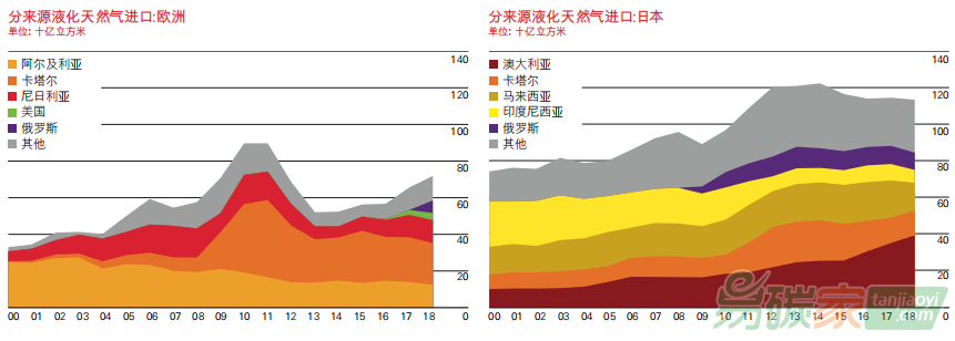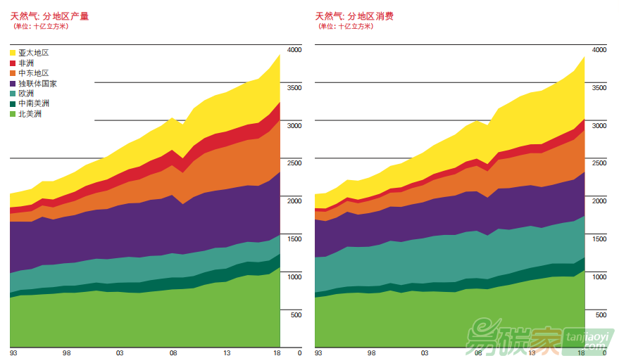 消費(fèi)增長(zhǎng)主要來自美國(guó)(780億立方米),其次是中國(guó)(430億立方米)、俄羅斯(230億立方米)和伊朗(160億立方米)三國(guó)。 全球天然氣產(chǎn)量增長(zhǎng)1900億立方米,增速達(dá)5.2%。其中,美國(guó)貢獻(xiàn)了幾乎一半的產(chǎn)量增長(zhǎng)(860億立方米)。2018年美國(guó)油氣產(chǎn)量增長(zhǎng)均打破了單一國(guó)家的歷史最高年產(chǎn)量增長(zhǎng)記錄。俄羅斯(340億立方米)、伊朗(190億立方米)以及澳大利亞(170億立方米)緊隨其后。 跨區(qū)域天然氣貿(mào)易增長(zhǎng)390億立方米,增速達(dá)4.3%,超過去十年平均年增速的兩倍。液化天然氣的持續(xù)快速擴(kuò)張是主要原因。 液化天然氣的供給增長(zhǎng)主要來自澳大利亞(150億立方米)、美國(guó)(110億立方米)和俄羅斯(90億立方米)。約一半的液化天然氣進(jìn)口增長(zhǎng)來自中國(guó)(210億立方米)。
