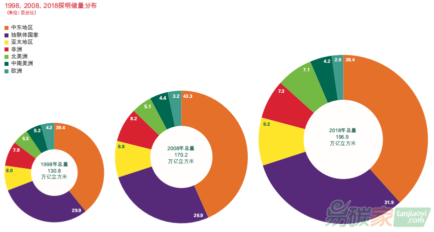2018全球天然氣探明儲(chǔ)量增加0.7萬億立方米,達(dá)196.9萬億立方米。增長(zhǎng)的原因主要是阿塞拜疆新增的儲(chǔ)量(0.8萬立方米)。俄羅斯(38.9萬億立方米)、伊朗(31.9萬億立方米)和卡塔爾(24.7萬億立方米)是儲(chǔ)量最高的三個(gè)國(guó)家。根據(jù)2018年的儲(chǔ)產(chǎn)比,全球天然氣還可以以現(xiàn)有的生產(chǎn)水平生產(chǎn)50.9年,相較2017年減少2.4年。中東(109.9年)和獨(dú)聯(lián)體國(guó)家(75.6年)的儲(chǔ)產(chǎn)比高于其他地區(qū)。