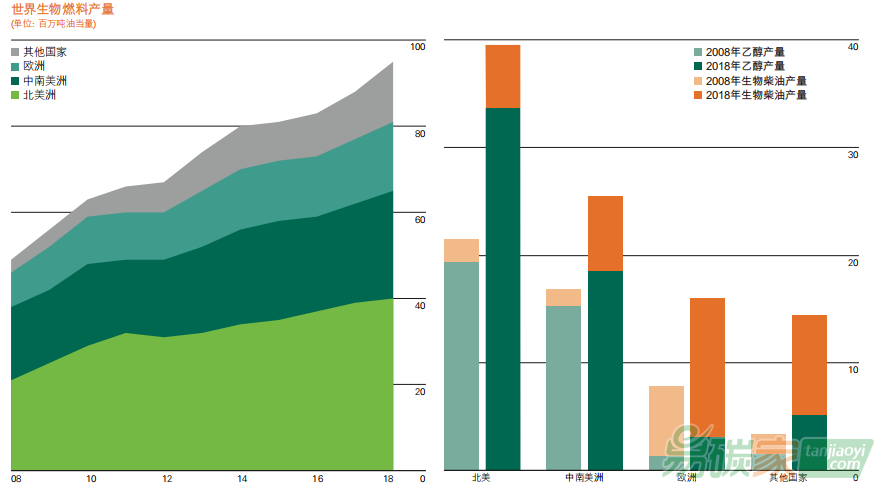 生物燃料產(chǎn)量在2018年的平均增速為9.7%,系2010年來的最高水平,略高于近十年內(nèi)平均增速。巴西(310萬噸油當(dāng)量)和印度尼西亞(220萬噸油當(dāng)量)共貢獻(xiàn)三分之二的全球增長(zhǎng)(850萬噸油當(dāng)量)。燃料方面,2018年的乙醇產(chǎn)量達(dá)到6040萬噸油當(dāng)量,其中北美洲國(guó)家占比達(dá)到56%。生物柴油產(chǎn)量達(dá)到3490萬噸油當(dāng)量,其中歐洲國(guó)家占37%。
