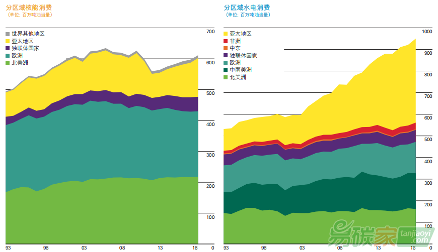 全球水電消費(fèi)上升3.1%,略高于近十年平均水平(2.8%)。中國(guó)(800萬噸油當(dāng)量)和巴西(400萬噸油當(dāng)量)貢獻(xiàn)了最大增量。亞太地區(qū)在全球水電消費(fèi)結(jié)構(gòu)中的比重在近年來顯著上升:2018年,41%的全球水電消費(fèi)來自亞太,而在二十年前這一比重僅有20%。