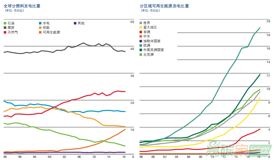 《年鑒》指出,可再生能源日趨成熟,但發(fā)電燃料結(jié)構(gòu)并沒有明顯優(yōu)化,非化石燃料(36%)和煤炭(38%)在2018年的占比和二十年前相比幾乎沒有發(fā)生變化。