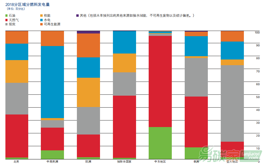 在北美洲,天然氣是最主要的發(fā)電燃料,其次是煤炭。中南美洲方面,超過一半的電力來自水電。在歐洲,核能、煤炭、可再生能源和天然氣發(fā)電的作用都很重要。天然氣目前是獨(dú)聯(lián)體國(guó)家和中東地區(qū)最重要的發(fā)電燃料。在非洲,天然氣和煤炭共計(jì)貢獻(xiàn)了七成的發(fā)電量。煤炭仍然是亞太最主要的發(fā)電燃料。