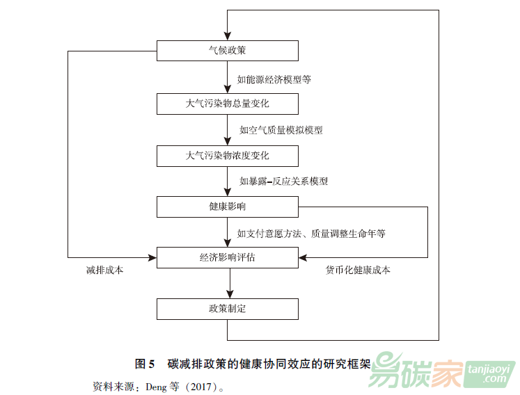 第五步,對比氣候政策的實(shí)施成本和貨幣化健康協(xié)同效益并給出政策建議。目前大多數(shù)研究停留在協(xié)同效應(yīng)的量化分析這一步(表1見原文),最多是通過比較不同政策的協(xié)同效益來對潛在的氣候政策進(jìn)行選擇。然而只計算氣候政策的健康協(xié)同效應(yīng),并不分析協(xié)同治理機(jī)制以及識別協(xié)同治理效率的關(guān)鍵影響因素,對于未來氣候政策制定的支撐是遠(yuǎn)遠(yuǎn)不夠的。評估氣候政策的協(xié)同效應(yīng)并不能改變氣候政策本身,只有明確協(xié)同治理機(jī)制以及關(guān)鍵影響因素,才能對政策的制定環(huán)節(jié)形成信息反饋,讓政策制定者明確怎樣的措施才能最大化協(xié)同治理效果,從而有效地指導(dǎo)未來氣候政策的制定。