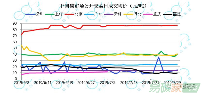 北京、湖北和上海履約截止日將至,三者市場配額價(jià)格波動性較低,穩(wěn)中略有小幅度上升,其中北京試點(diǎn)配額價(jià)格最高,達(dá)87元/噸左右,較6月(約83元/噸)有所上升。湖北配額價(jià)格繼6月中旬有小幅度提升后至7月底配額價(jià)格保持穩(wěn)定,均在38元/噸左右。上海配額價(jià)格較6月份基本保持穩(wěn)定,價(jià)格在40元/噸左右 。